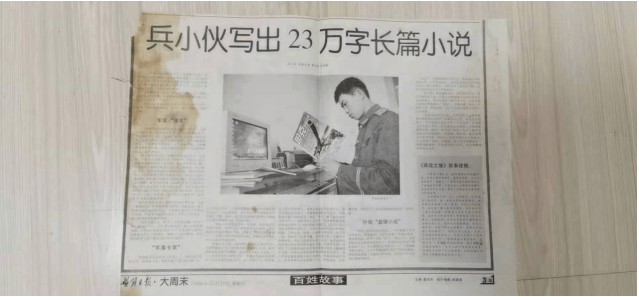银月光华:第一本小说初稿完成之后,一直想拿出去试试自己什么水平。当时我用电脑单机操作,用3.5寸软盘刻录好内容,邮寄给朋友发表,当时就被铁血的编辑看中,正式签约,这是意外之喜。那时候没有因为这本小说赚到钱,但却是一种重要的肯定。小说完结后受到了当地日报的关注,某一个下午记者来部队采访,当时部队干部也很高兴,认为我是给部队争光了,报道发表后我没想到篇幅居然很大,大概有半开报纸的四分之一版面,照片还很清晰。我最亲爱的姥姥还把报道压在茶几下,逢人来便能看到,姥姥去世后,我把那份报道留到现在。