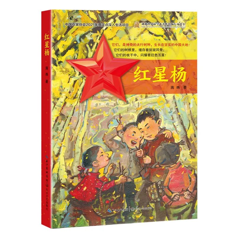蒋:非常感谢你对作品的准确定位,每每听到这样的提炼,就特别佩服评论者的精准视角。其实我初始写作时是乱的,除了清晰的“红星杨”,一切都是模糊的,结构更是,始终不知该如何布局。但经过“红星杨”一次又一次在脑中成长,从发芽到落下一地黄叶最后被大雪覆盖,它们的生命与精神也渗进我心里,再加上期间与几位老师的交流请教,最终三易其稿,终有了今天的面目。这本书的主角是孩子们,所以必须以孩子们为主线,而红星杨只是他们于玩耍时无意当中发现的,成了属于他们的秘密,这就有了神秘色彩。然而只让他们固守这个秘密,也只是小孩子之间的游戏,因此这秘密必须触碰另一个群体,那就是成年人。对我党地下工作者与八路军战士来说,那一村一墙的“红五星”有一种强烈的象征,这些图案让他们惊喜又担心。然而这还不够,两拨互相喜爱“红五星”的人,起不了冲突,因此敌人来了,这就是正在太行山中入侵的日军,这耀眼的“红五星”刺了他们的眼,于是展开大铲除。这骨子里刻着“五角星”的“红星杨”,便不再是单纯的树的形象,是一种象征,是人们的精神支柱与信仰,更是一种无法战胜的力量。其实这也是我在多年以后,以儿童小说的方式把“红星杨”推上前台的最根本原因。在太行山人心里,“红星杨”就是这样一种有意义的存在。