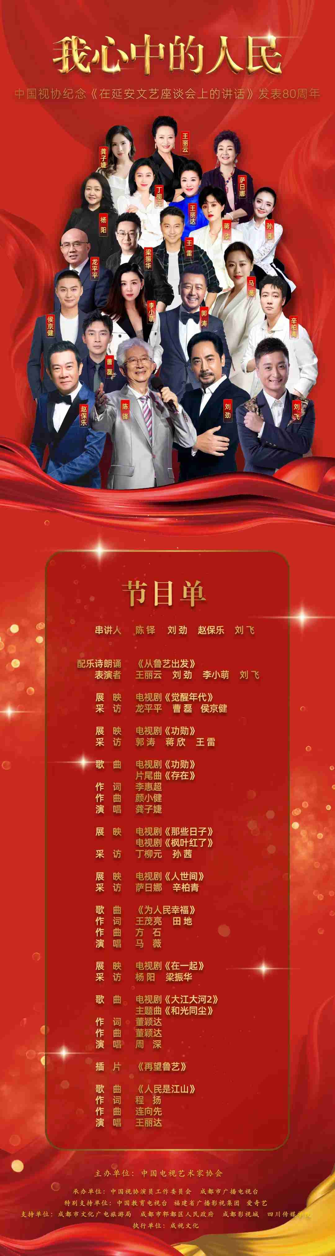 为了纪念毛泽东同志《在延安文艺座谈会上的讲话》发表80周年,高扬“文艺为人民服务”的主题思想,由中国电视艺术家协会主办,中国视协演员工作委员会、成都市广播电视台具体承制的“我心中的人民——纪念《在延安文艺座谈会上的讲话》发表80周年”特别节目将于2022年5月23日正式上线播出。