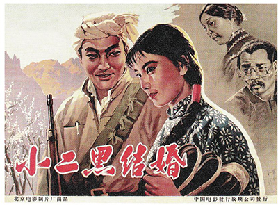 在延安文艺座谈会的影响下,作家赵树理于1943年创作完成短篇小说《小二黑结婚》。1964年,由北京电影制片厂根据该小说改编的同名电影上映,以电影的形式重温了抗战时期青年小二黑和小芹为追求婚姻自由,在党的关怀下冲破封建家长阻挠、结为夫妇的故事。电影《小二黑结婚》海报由著名军旅画家江平先生绘就。海报承袭了原著及影片活泼、清新的格调,富有质朴、浓郁的山西乡土气息,凸显出解放区进步青年的形象。