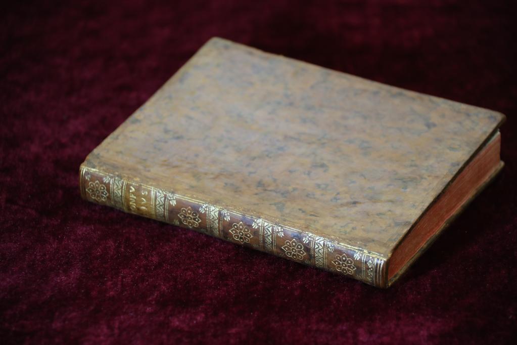 牛皮封面、飘口烫金、染纹纸环衬、书口刷红……这是一本富有法国启蒙时期书籍装帧特征的珍贵典籍,但其记载的内容,却是2000多年前中国的政治主张、伦理思想、道德观念。