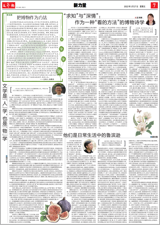 将视野聚焦于当下文学场域,博物学和自然文学、生态文学一样,正吸引着广泛的关注和讨论。不同之处在于,博物学或博物书写的边界似乎更为模糊,牵涉内容也更为繁杂。参与本期讨论的刘小波、王书婷,对现当代中国文学中的博物书写进行了开阔而清晰的梳理,从“看的方法”深度剖析了“博物何以诗学”,分享了诸多具有启发性的观察和思考。青年作家盛文强则现身说法,讲述“与自然界短兵相接”的心得。而他对于“鱼类学家的经验”与“渔夫的经验”的区分,别具深意。