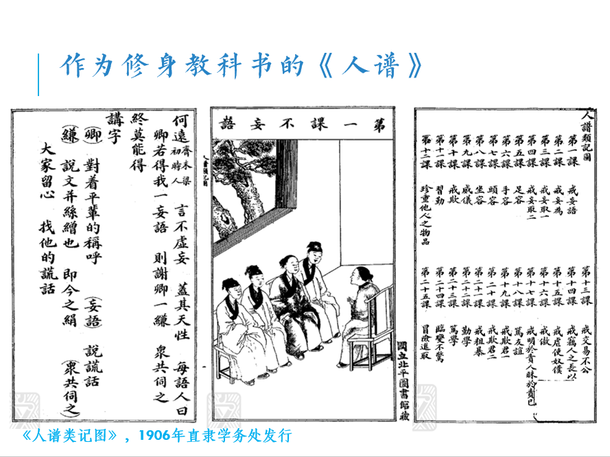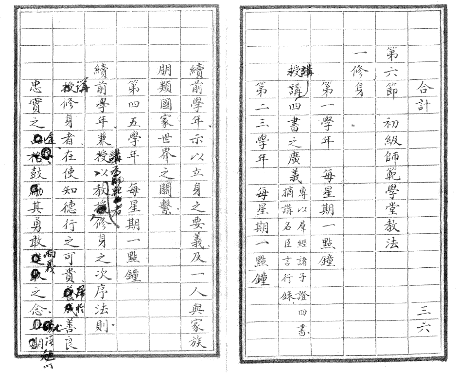 1904年初,癸卯学制对修身的目的及教法有更细致的规定。初等小学堂摘讲朱子《小学》、刘宗周《人谱》及各种养蒙图说,读有益风化之古诗歌,为儿童立“爱国家之根基”[10]。在师资稀缺的地区,另立“简易科”,将修身课与读经课合而为一,于讲经时带讲修身。《奏定初等小学堂章程》对修身科的设想,有三点值得注意:一是把明儒刘宗周的《人谱》作为修身教科书[11],二是以讽诵古诗歌作为幼童涵养性情之道[12],三是修身与读经在乡野之地可合并讲授。高等小学堂的修身科,每星期2钟点,讲授“四书”要义,“以朱注为主,以切于身心日用为用”;共四学年,每年修身科的课程内容相同,而读经讲经科则有程度之递进,从《诗》《书》到更艰深的《易经》及《仪礼》节本,每周课时是修身科的6倍。[13]