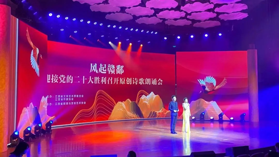 5月31日晚,由江西省文联、省作协主办的“风起赣鄱”——迎接党的二十大胜利召开原创诗歌朗诵会在江西艺术中心音乐厅举办。省委常委、省委宣传部部长庄兆林,省政府副省长、党组副书记殷美根及省直有关单位的领导和嘉宾出席晚会。来自省内外的著名诗人、作家、媒体记者及文学爱好者共400余人参加了活动。