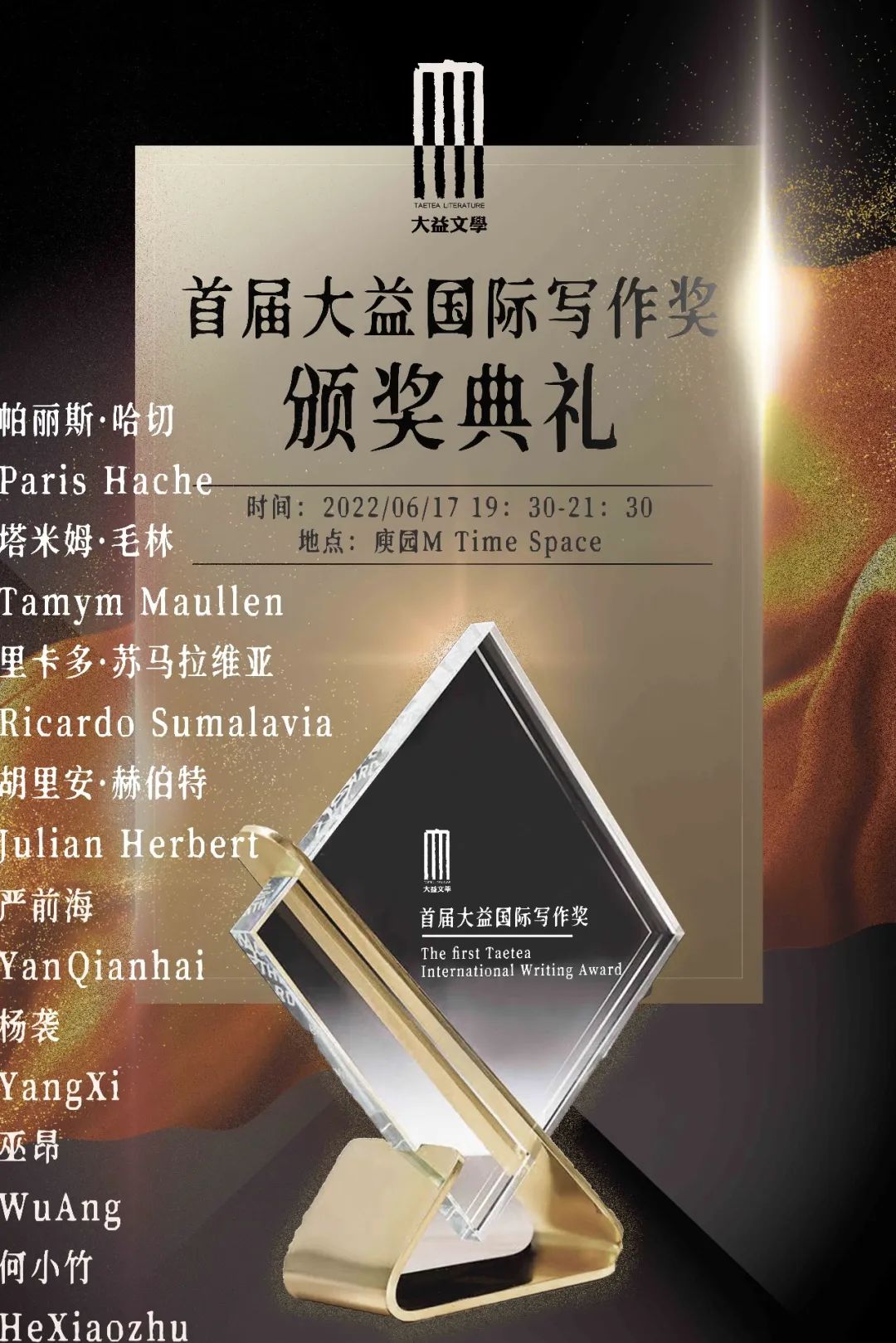 首届大益国际写作奖颁奖典礼将于6月17日晚在典雅的庾园举办,并现场揭晓最终奖项得主。活动现场还增设入围作品朗诵、读者互动提问、大益八式表演等环节,以及“电竞竞猜的土地——拉美文学三人谈”嘉宾对谈。《电竞竞猜的土地》这部作品被公认为拉美后现代主义文学的典范之作,大益文学还邀请到此书的译者,西班牙语翻译大家林一安先生通过线上的方式与观众见面。
