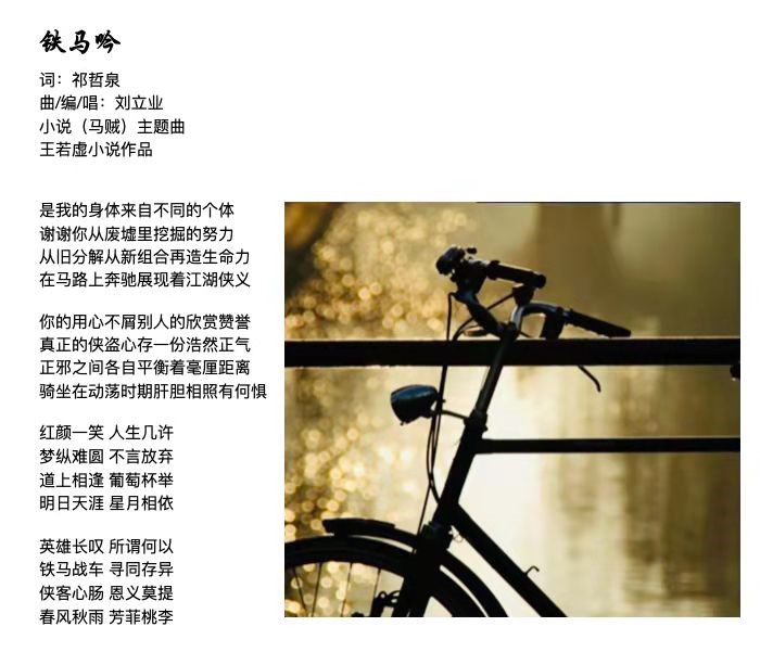 文学是文艺创作的“母本”,在小说灵感的启发下,新加坡读者俱乐部别出心裁邀请新加坡音乐人祁哲泉作词、马来西亚歌手刘立业作曲,为小说《马贼》创作了主题曲《铁马吟》。这首原创主题歌曲在此次导读活动上正式发布,以Rap说唱形式唱出了校园里的侠义与情感。由于歌曲发布前并未向任何人透露,作者王若虚感到十分惊喜和开心,表示感受到了新加坡读者浓浓的热情。