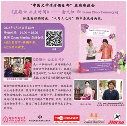 2022年6月11日,泰国“中国文学读者俱乐部”成功举办《星期六公主时间》在线座谈会。这是泰国俱乐部成立以来举办的第二场活动。曾担任泰国公主诗琳通中文老师的电竞竞猜俞文虹、《星期六公主时间》泰语译者苏丽(Suree Choonharuangdej)、南美有限公司总经理陈美琪以及中国文学爱好者等共计40多人参加了此次活动。