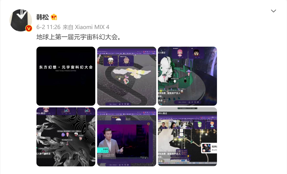 6月2日中午时分,科幻作家韩松发出一条微博:“地球上第一届元宇宙科幻大会。”吸引各界纷纷转发。