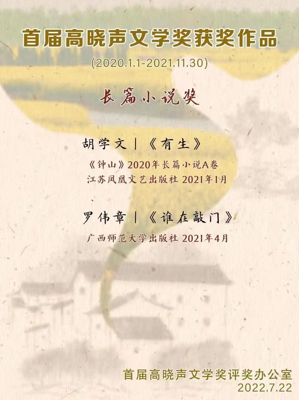 7月22日,首届高晓声文学奖在江苏省常州市揭晓,《有生》《空山》《喝汤的声音》等10部(篇)作品分获长篇小说奖、中篇小说奖、短篇小说奖。江苏省作家协会党组成员、书记处书记、副主席丁捷,常州市委宣传部副部长、市新闻出版局(版权局)局长谢春林,常州市文联党组书记、主席舒文,南京大学教授王彬彬,江苏凤凰文艺出版社原社长黄小初等出席首届高晓声文学奖新闻发布会。发布会由常州市委宣传部四级调研员王志新主持。