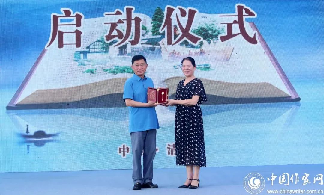邱华栋为电竞竞猜“深入生活、扎根人民”新时代文学实践点授牌,湘西州州委书记虢正贵接牌。