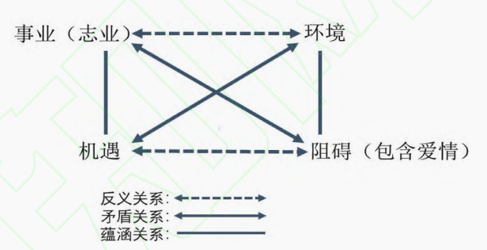 将作品代入图3这一“意义矩阵”之中进行内容赋值,可以清晰地呈现其深层叙事结构,由此阐释其阅读接受中所出现的相应问题。例如沉筱之的古言作品《青云台》,“事业”是对于洗襟台坍塌一案的清查,“环境”则由各个阶层合力铸成,密不透风,虽然各方立场不同,但是他们各自注入洗襟台的私欲都让真相难以被揭开。旧日工匠、书生、山匪等角色的接连出现衍生出了主人公的追寻轨迹,而言情线“不由自主”地拖累着事业线这一主线的推进。温小野与小昭王的言情线每一展开,叙述时间便延宕下来。尤其是下卷中,各方势力的联合“绞杀”为悬案的加快侦破带来紧迫性,但言情线上时间流速的舒缓与行动要求的快节奏相矛盾,造成了彼此氛围“对冲”的效果。所以,虽然温昭二人的“爱情”并不与“事业”相对立,却不由得建立了“反义关系”。作者沉筱之为了避免因两条线索“打架”影响故事的发展,放弃了言情线的继续,而读者也纷纷诟病悬疑线的拖沓和言情线的骤然消失。