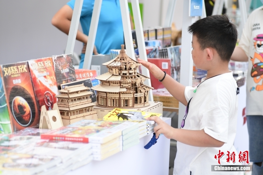 8月4日,市民在北京王府井步行街观看户外大屏上播放的动画片,在北京王府井步行街体验动漫绘本,小朋友在北京王府井步行街观赏祈年殿拼插模型。