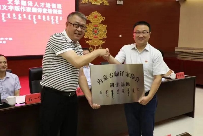 内蒙古文联党组成员、副主席包银山为兴安盟科右中旗文联授予内蒙古翻译家协会创作基地牌子