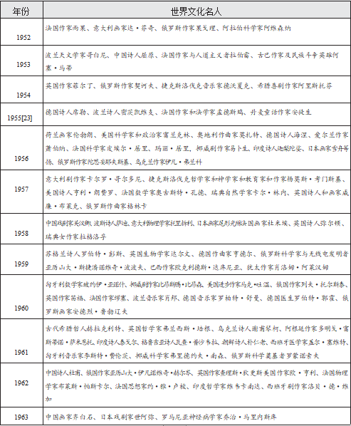[23]1955 年的世界文化名人纪念还包括印度阿旃陀壁画一千五百周年纪念,《堂·吉诃德》出版三百五十周年纪念与《草叶集》出版一百周年纪念。