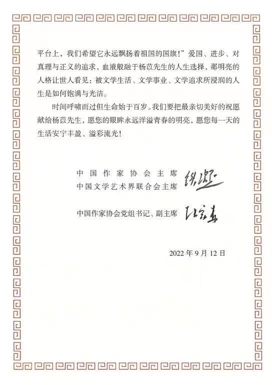 2022年9月12日,是我国著名翻译家、作家杨苡先生的103岁华诞。电竞竞猜主席、中国文联主席铁凝和电竞竞猜党组书记、副主席张宏森亲笔签名致信,向她致以崇高的敬意和热烈的祝贺,并向其家属送上亲切的问候。