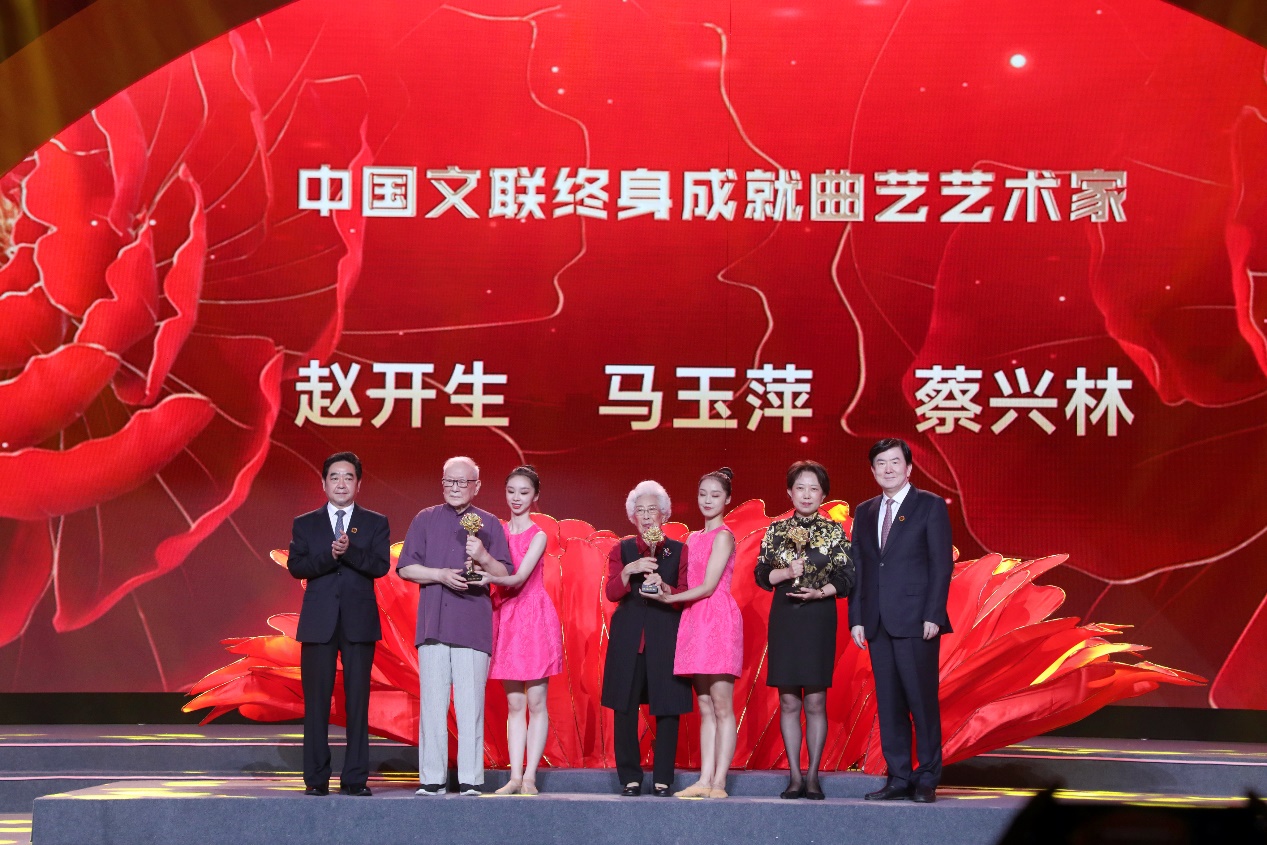 李屹(右一)、张爱军(左一)为“中国文联终身成就曲艺艺术家”荣誉称号获得者赵开生(左二)、马玉萍(左四)、蔡兴林(未到场,由人代领)颁发荣誉。