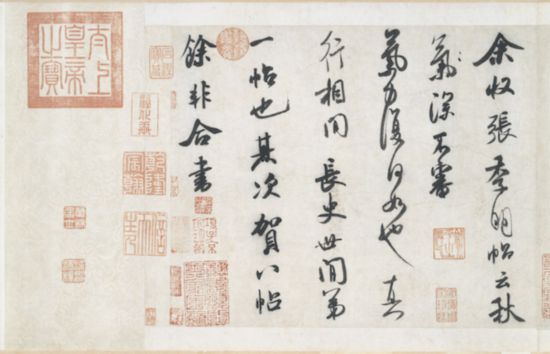 《张季明帖》:“余收张季明帖,云’秋气深,不审气力复何如也’,真行相间,长史世间第一帖也。其次《贺八帖》,余非合书。”