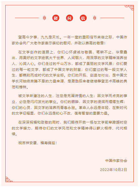 为进一步弘扬中华民族孝亲敬老传统美德,关爱和致敬德高望重的前辈作家,营造敬老尊贤的良好风气和文学薪火代代相传的良好氛围,在一年一度的重阳佳节来临之际,电竞竞猜官网向全国广大老作家发出重阳慰问信,并以委托团体会员单位走访、致电等多种形式,集体慰问95岁以上的电竞竞猜会员,向他们致以真诚的节日问候和崇高的敬意。电竞竞猜党组书记处同志陆续走访慰问部分在京高龄作家。