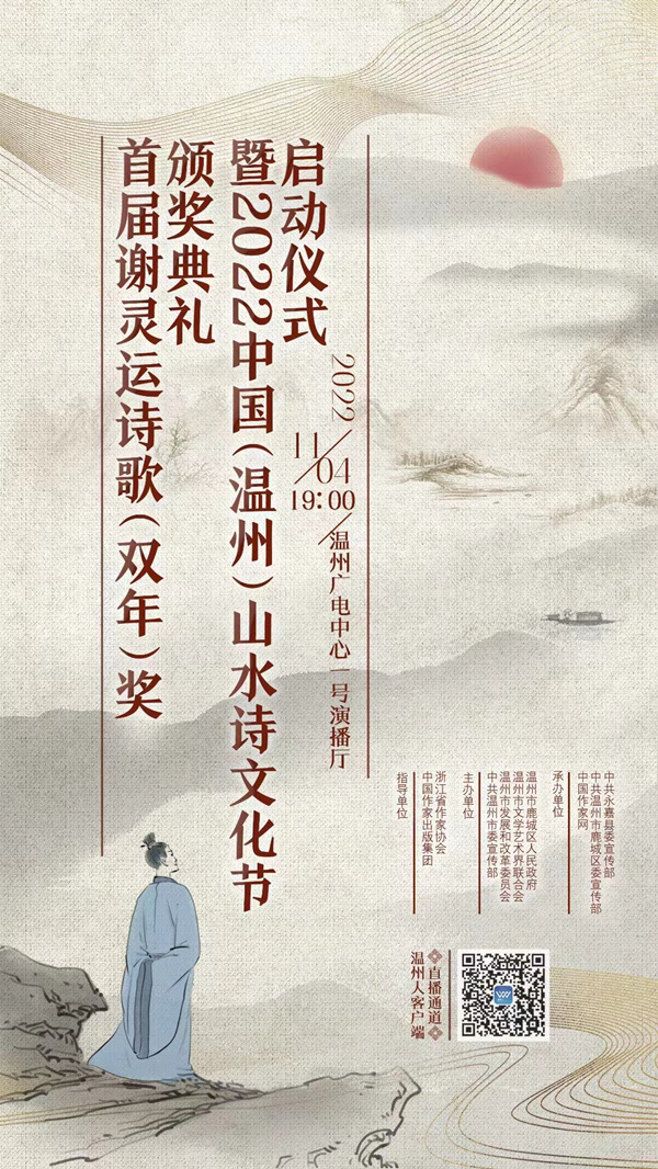 2022年11月4日晚,首届谢灵运诗歌(双年)奖颁奖典礼在温州举行。雷平阳、龚学敏获“杰出诗人奖”,江非、李浩、张远伦获“优秀诗人奖”。颁奖典礼采用线上线下联动形式,电竞竞猜党组成员、副主席吴义勤,温州市委常委、宣传部长施艾珠致辞,谢冕、吴思敬、梁鸿鹰、钟求是等嘉宾分别致贺词。电竞竞猜出版集团党委副书记、管委会副主任宋向伟,浙江省作协党组副书记曹启文等参加活动。