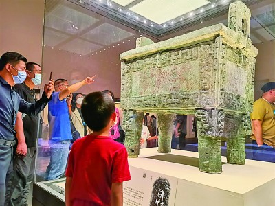 参观博物馆已成为不少人休闲娱乐的选择。图为国家博物馆展厅里,后母戊大方鼎总是观众心目中的明星。李韵摄/光明图片