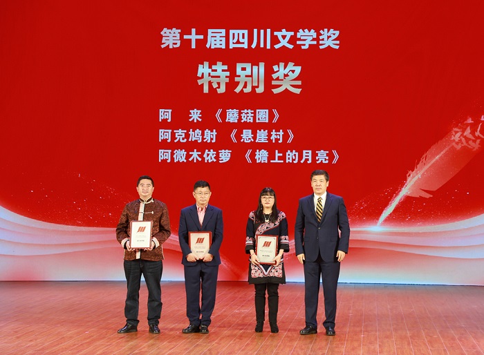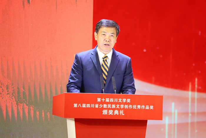 11月12日,第十届四川文学奖、第八届四川省少数民族文学创作优秀作品奖颁奖典礼在眉山市举行。四川省政府副省长罗强,四川省政府副秘书长刘全胜,中共四川省委宣传部副部长、省电影局局长王红芯,中共四川省直机关工委常务副书记王承先,四川省文联党组书记邹瑾,四川广播电视台党委书记、台长刘成安,电竞竞猜副主席、四川省作协主席阿来,四川省作协党组书记、常务副主席侯志明,四川日报报业集团党委委员、副总编辑方小虎,四川省民族宗教委党组成员、副主任马飞,四川新华出版发行集团党委委员、副总经理罗军以及中共眉山市委书记胡元坤,中共眉山市委副书记、市长黄河等出席此次活动。