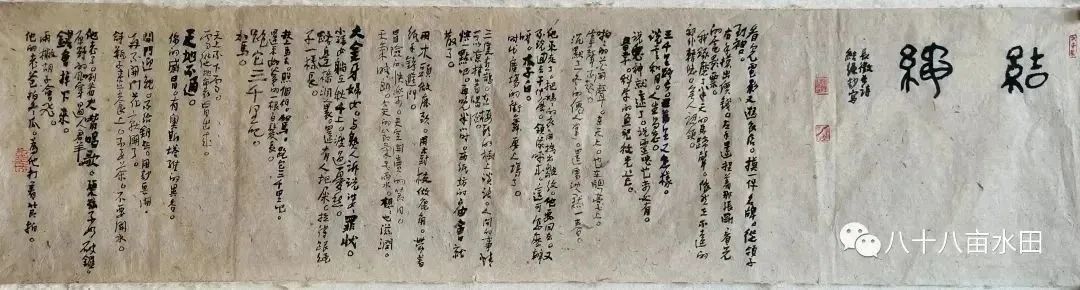这是我平生真正事笔墨以来,第二次抄读如此长的文字。第一次是2015年,抄读之道在印度尼西亚写的长诗《咖啡园》,那次用了一个礼拜的时间,共抄写了四大本册页。这次抄写《结绳》,我用了三天时间,在34/136厘米一张的毛边纸上共写了11张,这11张横向竖排下来,就像一个层层排列的墨绳矩阵。《结绳》长征写了119首,他有意没写足120首凑一个偶数整数,而是用一个奇数了结,肯定也有他的深意。我这同样也为奇数的11张,正好暗合了长征的意图。抄写完成后,除了起首和落款,我本不想再在其它页面上使用印章。我私下忖度,如此长诗构成的绳阵,那行间的崎岖错落,墨迹的枯润干湿,单字的大小繁简,分布的疏密留白,完全没必再要用印章来调整。但我还是在每一张上或多或少地盖了一些。这些印章留下的鲜红印痕,在黑色的墨迹之中分外夺目。我希望它们即是太阳,也是月亮和星星,照耀着古人,也照耀着今人;照耀着开天辟地的旷世文明,也照耀着纷繁芜杂的现代生活。同时,我还希望其中最不显眼的一枚就是我,坚定地站在墨河的此岸,也站在彼岸,听时光之笔挥洒出的风霜雨露,波涛雷霆。而我,见证了这一切,就像见证了自己的人生。我素来崇尚谦和虚冲、沉静练达、余音绕梁的文字,喜爱蕴藉含蓄、用笔如刀、纸墨相生的书法,这次抄读长征《结绳》,我却忍不住昂扬激奋起来,书几如野狐禅,文亦词不逮理,颠三倒四,差点儿满嘴里和满纸上都跑了火车。