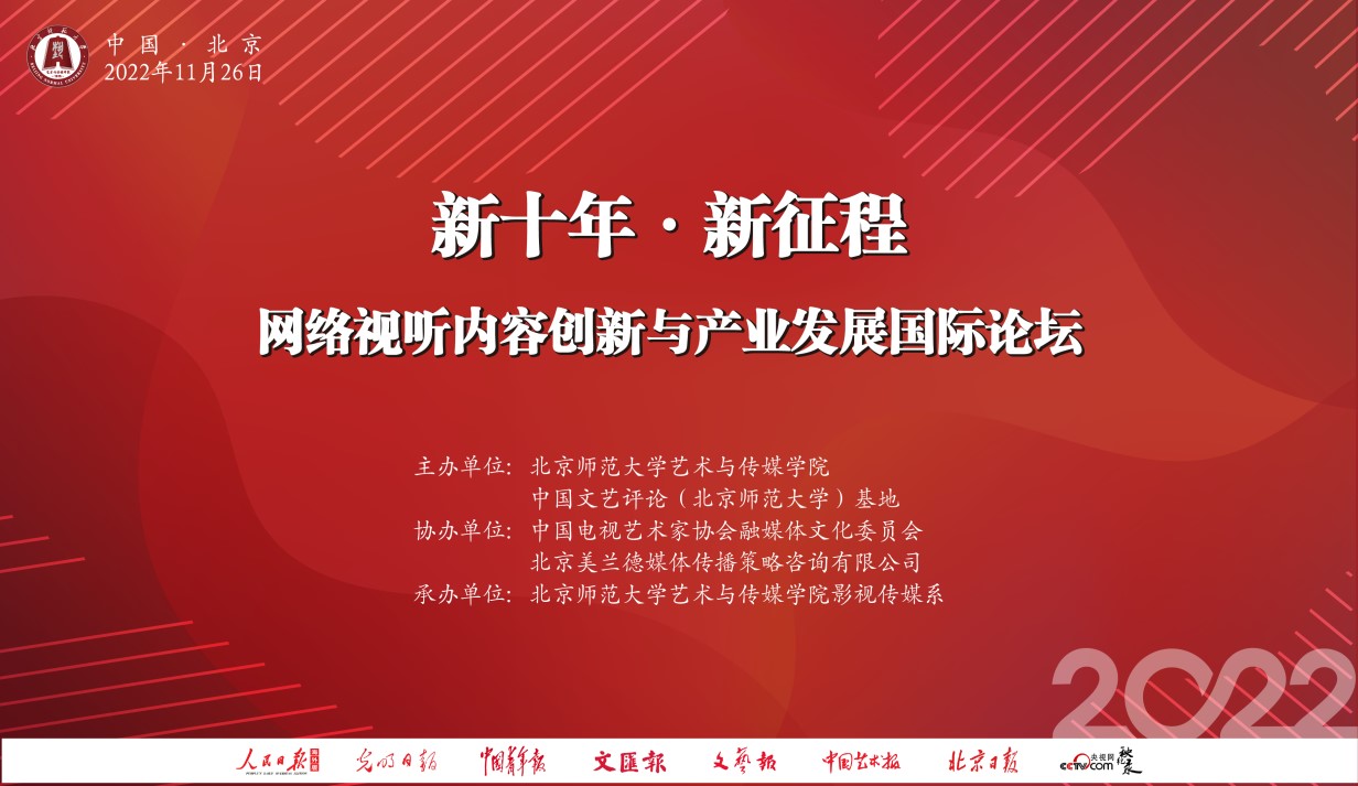 11月26日,由北京师范大学艺术与传媒学院、中国文艺评论(北京师范大学)基地主办,中国电视艺术家协会融媒体文化委员会、北京美兰德媒体传播策略咨询有限公司协办,北京师范大学艺术与传媒学院影视传媒系承办的新十年·新征程 网络视听内容创新与产业发展国际论坛在腾讯会议线上召开。此次论坛分为开幕式暨主论坛及网络综艺、网络电影、网络剧集、网络纪录片四场平行分论坛,云集36位国内外学界、业界资深学者专家,共同探讨网络视听内容和产业高质量发展的新路径,为网络视听行业持续繁荣发展贡献智慧与力量。