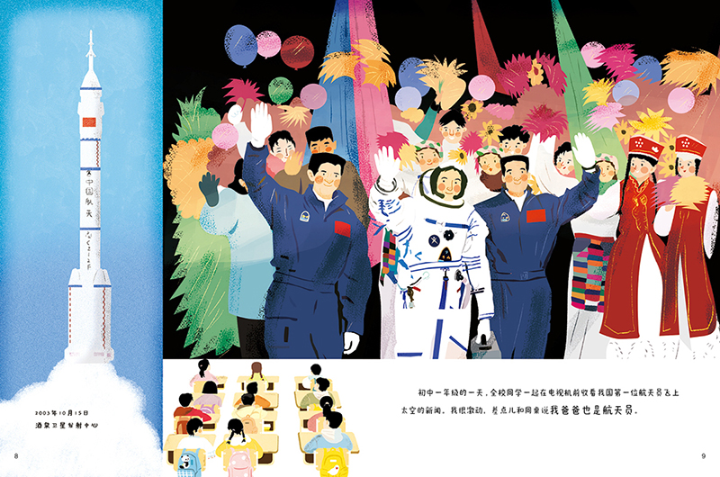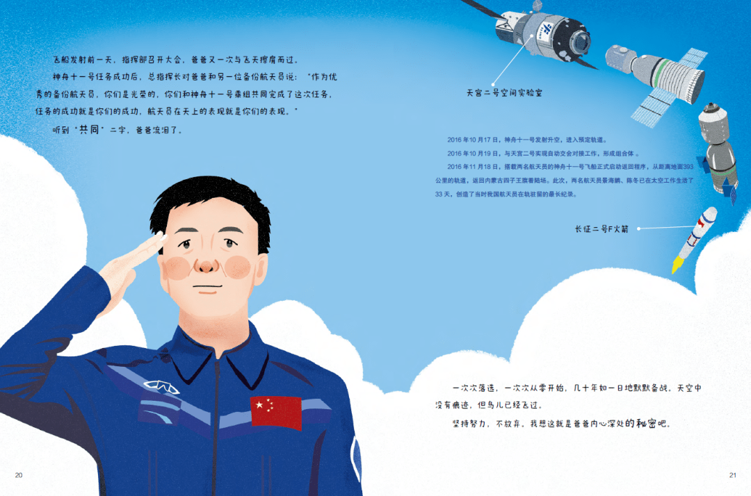 赵墨染:2016年我在清华美院读书的时候选择做科普绘本的研究,有了一些科普绘本的创作经验。2018年中国少年儿童新闻出版总社的唐威丽老师联系到我说有这样一个航天员的故事,问我感不感兴趣。本身我对航天题材也很感兴趣,看了邓清明父女《朗读者》的节目后,被深深地打动了。之后在出版社的安排下我和邓清明的女儿满琪见面了,自此开始了电竞竞猜三年的创作之旅。这三年电竞竞猜线上线下沟通了多次,她给我提供了非常详尽的资料。比如故事的脚本,相关的影像资料,参考书籍、电影和纪录片等等。从文字到分镜图再到正稿,满琪很认真地校对每一处。因为她作为航天人的专业背景,有她在我会很踏实。说到印象最深的瞬间是神舟十一号任务准备阶段,满琪在指挥大厅值班看到爸爸出现在大屏上,她眼含泪水的样子让我难忘。