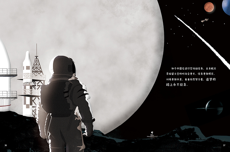 赵墨染:科普类型的绘本创作更需要大量的资料研究和科学求真的精神。尽可能多看资料,多去实地考察。就怕创作时需要画,却没有素材可参考。要在有限的体量内,讲清楚想表达的故事,对资料的分类整理必不可少。如何将这些素材编辑好,讲好这个故事也是研究重点。比如一开始做《爸爸的秘密》这本书,书中涉及航天专业知识的图形化对我来说确实是个难关,但随着创作的深入,资料收集越来越充分时,我开窍了,也得心应手起来。关于航天员训练、中国航天大事记、航天器等画面我运用了视觉传达设计中的信息图表的方法,按照时间线分类以及做儿童喜欢的图形化的设计,在排版上注意图文的关系,让读者更清晰地了解这些科普知识。总结而言是对内容的理性梳理和感性呈现。