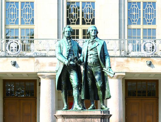 提起魏玛,人们一般知道1918年德国崛起的魏玛共和国。然而,魏玛所以驰名于世,还是由于这里名流辈出,尤其是有19世纪德国著名作家、诗人歌德和席勒。他们一同与新古典派相抗衡,在德国掀起浪漫主义运动,声浪波及法国、意大利和西班牙,构成欧洲文学艺术在世界文苑的重要流派。