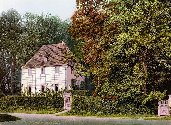 1749年一个暗夜里,歌德降生在德国东部美茵河畔的法兰克福,但他一生50余载,都是在距离柏林300公里的魏玛市度过的。他以满腔热诚,使这座边城变为19世纪欧洲大陆浪漫主义风潮的源泉,在德意志文坛激荡翻滚了整整半个世纪,余波远远超出德国的疆界。在英伦三岛,涌现出拜伦、雪莱、华兹华斯和柯勒律治。在北国俄罗斯,有普希金和莱蒙托夫,远至大洋彼岸的是惠特曼和爱伦·坡。各分支流派此伏彼起,以抒情美感的心源追求个性解放,乃至整个民族的自由与独立。历史事实上,浪漫主义潮流主要是在德国拓展开来,一定程度上与歌德以魏玛为中心的漫长文学生涯紧密联系。因而,该市的街巷、花园均留有自然与文学艺术融合的记忆。