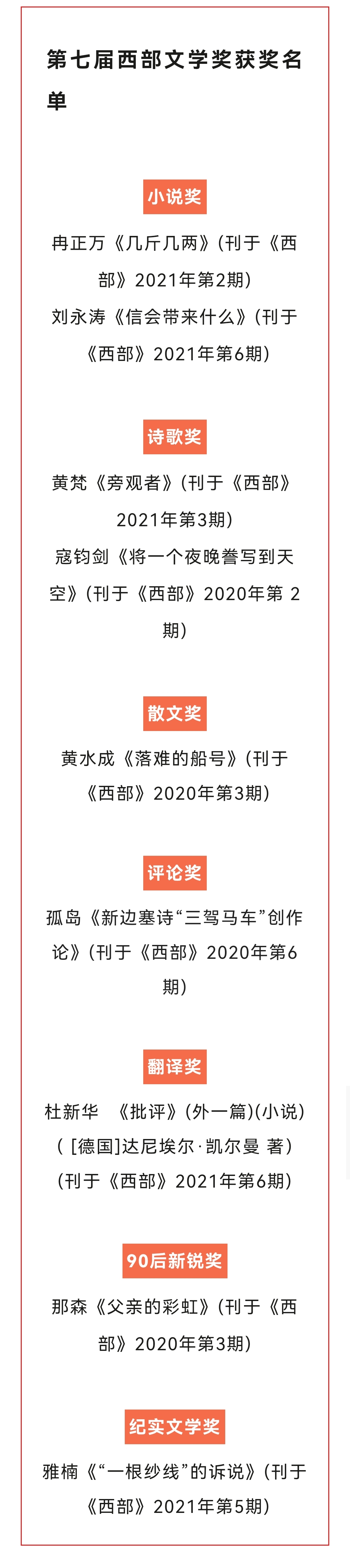 第七届西部文学奖获奖名单。《西部》杂志社供图
