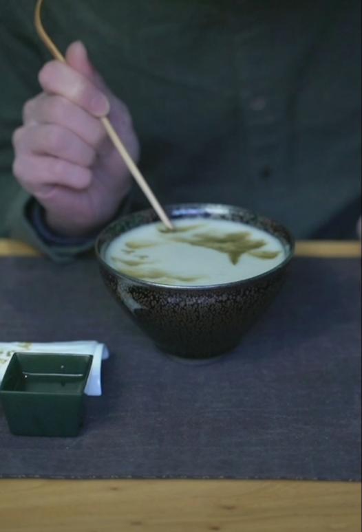 “无由持一碗,寄与爱茶人。”茶百戏表演中,粗笔勾勒,工笔细描,一幅写意山水画就出现在建盏之上。兔毫釉面衬得茶沫绵密细腻,抹茶粉末画就的山水意境悠远,传承了千年的品茗意趣就这么生动地展现在众人面前,就如同茶日历里收录的宋代饮茶图一般,令人心向往之。