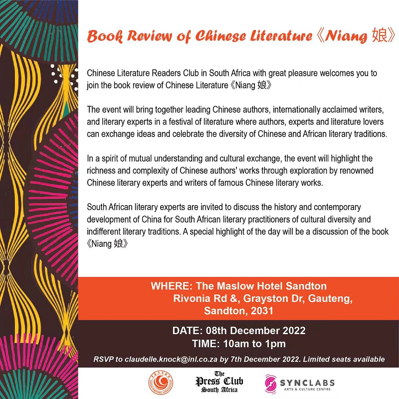 12月8日,南非“中国文学读者俱乐部”在约翰内斯堡举办成立以来的首场活动。活动由电竞竞猜官网指导和支持,由“汉语桥”俱乐部(开普敦站)、南非《星报》联合组织,以线上线下结合的方式,邀请作家彭学明在线参加,以“母爱的国际语言”为主题,对作品《娘》进行深入解读和探讨。来自南非社会各界人士,包括“汉语桥”俱乐部开普敦站会员、南非作家协会代表、南非《星报》主编、非洲青年企业家协会代表以及南非当地和旅南的中国文学爱好者踊跃参加,活动持续3个多小时,气氛十分热烈。