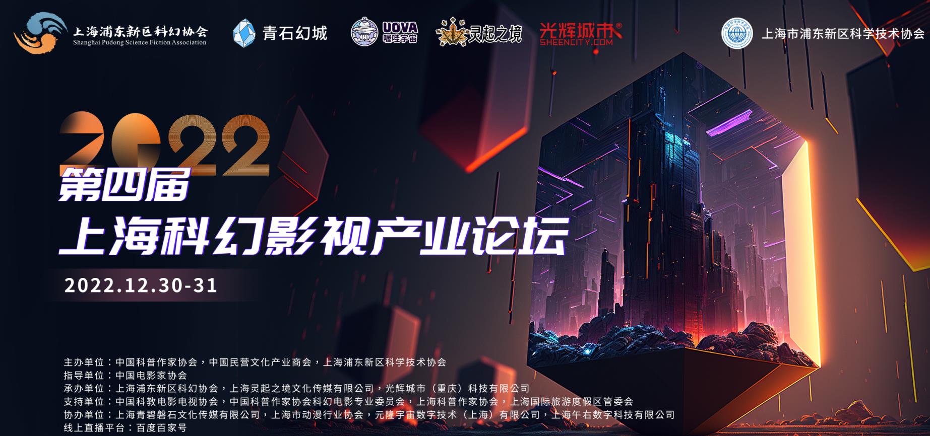 12月30日-31日, 2022第四届上海科幻影视产业论坛以线上直播的形式举行。本次论坛由中国科普作家协会、中国民营文化产业商会、上海浦东新区科学技术协会主办,中国电影家协会任指导单位,中国科教电影电视协会专业工作委员会、科幻委员会,中国科普作家协会科幻电影专业委员会,上海科普作家协会和上海国际旅游度假区管委会,全国少儿科幻联盟等任支持单位,上海浦东新区科幻协会、上海灵起之境文化传媒有限公司、光辉城市(重庆)科技有限公司等共同承办。在聚焦科幻影视产业发展的基础上,本届论坛将重点关注元宇宙时代下科幻数字文娱产业与元宇宙技术的结合与未来展望,以多个专场论坛、高层对话及项目路演的形式,带来一系列2022年最新科幻元宇宙技术与科幻文娱产业结合的技术分享与成果展示,全面推动科幻元宇宙产业联动与合作。