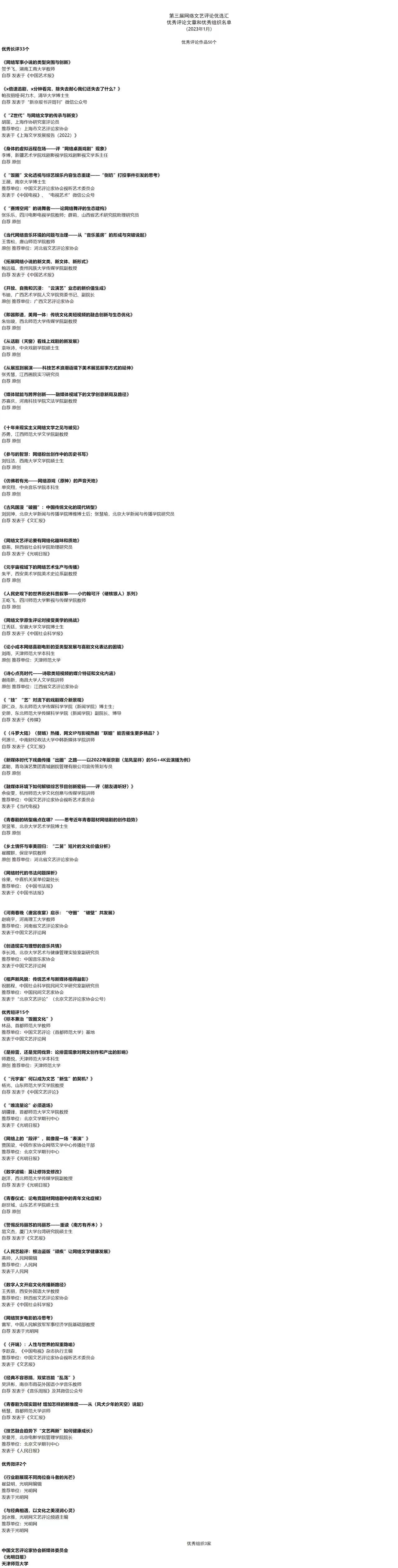 会上,第三届网络文艺评论优选汇同期发布成果。网络文艺评论优选汇经中国文联批准,每两年举办一届。活动旨在切实贯彻中央关于加强和改进网络文艺评论工作、加快建立网络综合治理体系等明确要求,有效团结凝聚壮大网络文艺评论队伍,推动构建良好网络文艺生态。本届优选汇以“中国网络文艺这十年”为主题,吸引全国各高校、科研院所、文化机构和新文艺群体评论工作者积极参与,共有695个作品参评,其中长评335个、短评323个、微评37个。经过初评、复评、终评三轮专家匿名评审和网络票选,并报中国文联批准,最终推选出优秀作品50个,其中长评33个、短评15个、微评2个,同时评选出3家优秀组织。