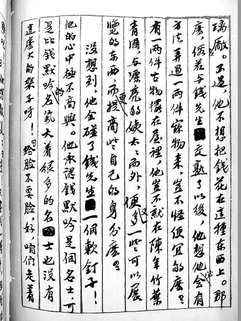 翻开老舍的手稿,确实可以看到如舒乙所述,它始终是作者自己的手迹(一些话剧剧本曾请秘书帮抄过),就是那么一直到底严守500字小绿格,端端正正、规规矩矩,一字一字地写下来。遇有修改的地方,旧的,用钢笔水严严实实地涂掉(让你无法辨识出原来是什么字),然后再十分专业地勾线,在空白处写上改后的文字。对于作者手稿后期工作的出版环节,编辑人员,排录人员,校对人员,面对这样的稿子都是一件幸事。舒乙说《正红旗下》手稿整齐干净而漂亮,是手稿中的上品、艺术品、珍藏品,这是“观千剑而识器”的内行之论。说实在的,不真个地亲自翻一下这件手稿,您对这些评述的感觉总还是不落实,虚浮想象。