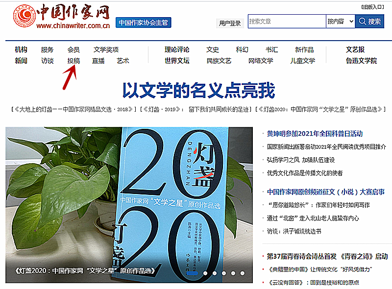 1、首先登录电竞竞猜官网http://www.chinawriter.com.cn/ 在首页顶端频道分类位置找到“投稿”(标红色箭头处),点击进入原创频道。