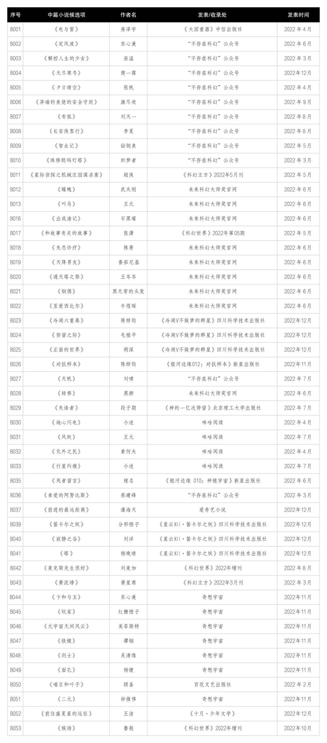 本届获得组织委员会资质认证的中篇和短篇小说非纸质专业发表平台有八家。一部分属于上一届通过认证的平台,经过更新补充资料,继续维持资质认定;另一部分属于新申请平台,经过复核申请资料后也通过了资质认定,名单如下:蝌蚪五线谱;未来事务管理局“不存在科幻”微信公众号;“八光分文化”微信公众号和冷湖科幻文学奖;第十届未来科幻大师奖;第十一届光年奖;咪咕阅读(包括《奇想》电子杂志);17K中文网(包括“奇想宇宙”和“谜想计划”);爱奇艺小说。所有通过资质认证的平台其申报后符合参评标准并通过候选资格复核的中短篇小说已经收入《候选参考名单》。