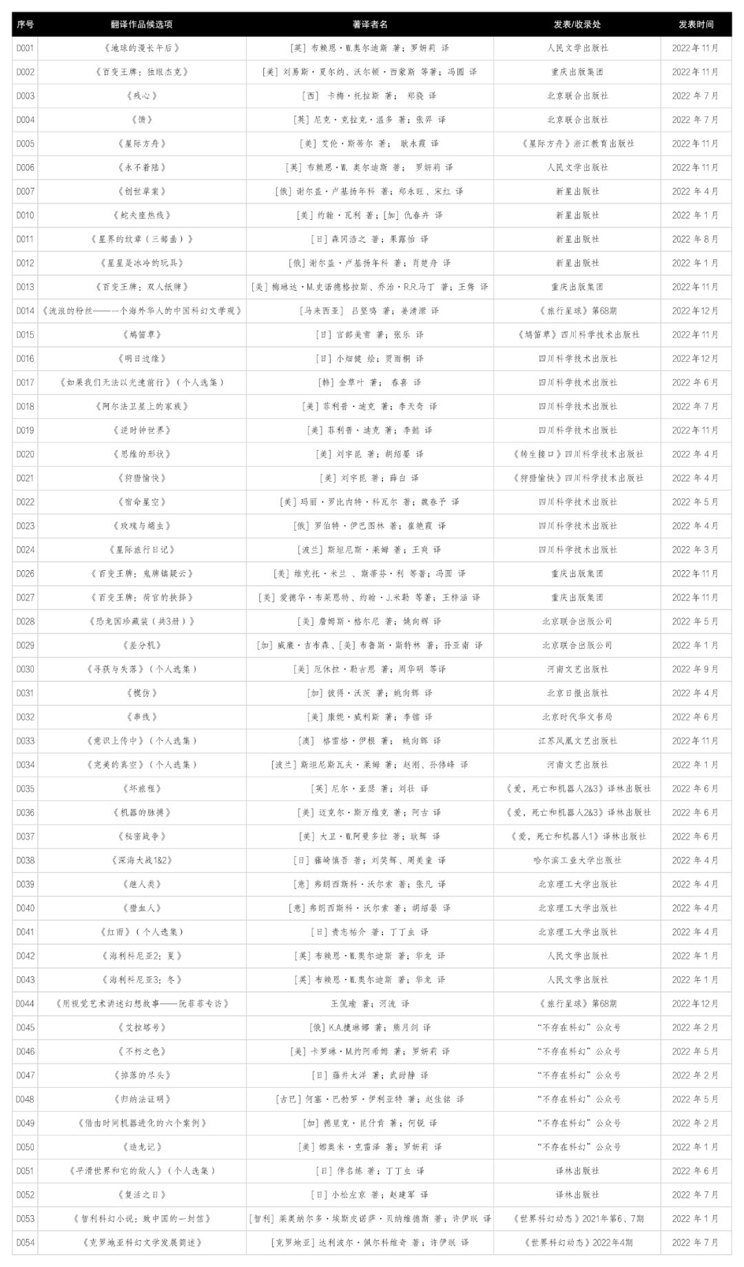 四、翻译作品候选参考名单