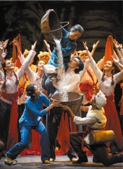 延安木刻版画是中国美术的瑰宝。该剧用舞蹈语汇呈现《来了亲人八路军》《当敌人搜山的时候》《豆选》等黑白版画作品,将版画硬朗坚挺的线条笔触与民间舞的气韵风格相结合,通过动态舞姿让版画“流动”起来。不少剧情来源于版画,比如第一幕群舞“抗旱”,便是对古元创作于1943年的版画《抗旱》的动人再现。