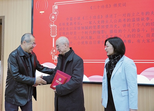 武汉市文联党组书记、副主席章建育(右一)与原新疆作协主席董立勃(左一),共同为中篇小说《三十功名》作者於可训颁奖 通讯员供图