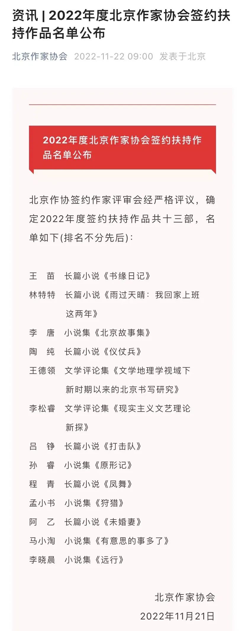 北京作协公众号签约名单新闻截图