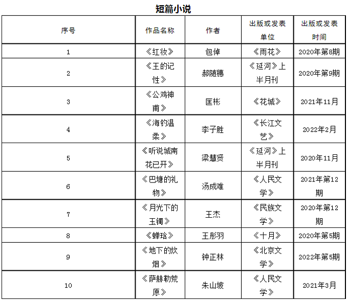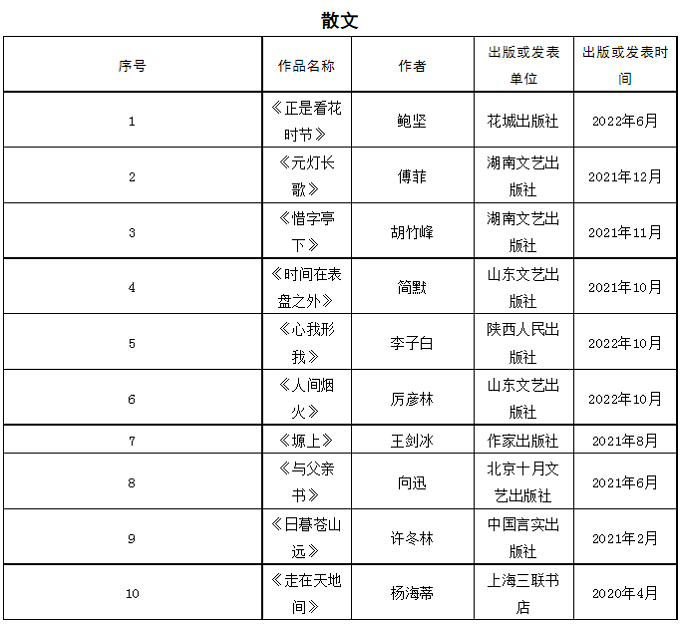首届石峁文学奖初评委员会经过认真阅读讨论,于2023年4月17日投票表决产生50部(篇)初选作品。现将初选作品名单在鲁迅文学院微信公众号和电竞竞猜官网(http://www.chinawriter.com.cn)公示。公示期截止于2023年4月21日,在此期间,如发现初选作品有不符合《首届“石峁文学奖”参评作品征集启事》的情况,请向评奖办公室提出。
