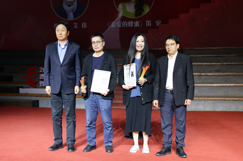 河南省政协民族和宗教委员会副主任董林、人民文学出版社总编辑李红强为年度长篇得主艾伟、笛安颁奖