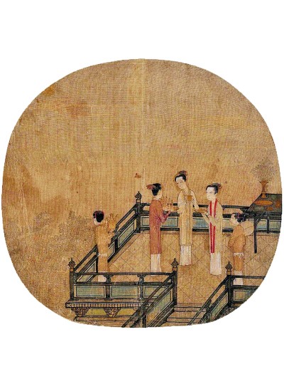 宋代画作亦呈现女性服饰之浓郁“色韵”。画作《女孝经》中的女性穿着,有淡绿衫配淡紫裙、白衫配淡绿压花裙、淡蓝衫配淡黄裙等,披帛外搭相应为淡蓝、淡紫和淡黄,女性服色呈现出素淡搭配之主流。《瑶台步月图》为北宋画家刘宗古创作,画中女子身着淡青镶边淡紫褙子或红色镶边淡青褙子,而裙子均为白色,衣着素淡简朴,气质高雅脱俗。《盥手观花图》中服色搭配更为柔和,女主上穿淡紫窄袖长襦,下穿白色长裙,外搭淡黄披帛;侍女穿淡绿袍衫搭淡黄腰间宽巾,亦有穿淡蓝袍衫搭白色腰围。《清明上河图》为中国古代著名绘画,由宋画家张择端创作,画中少有女性,普通劳动妇女多穿青色裙或腰系青花围巾,有身份的女子戴盖头、穿紫色褙子,具有简约、素雅之宋代服饰文化风格。