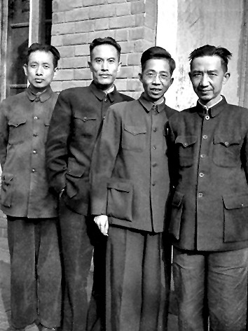 1951年,北京东总布胡同22号中华全国文学工作者协会大院内萧殷住所门前合影。左起:艾芜、张天翼、萧殷、沙汀。