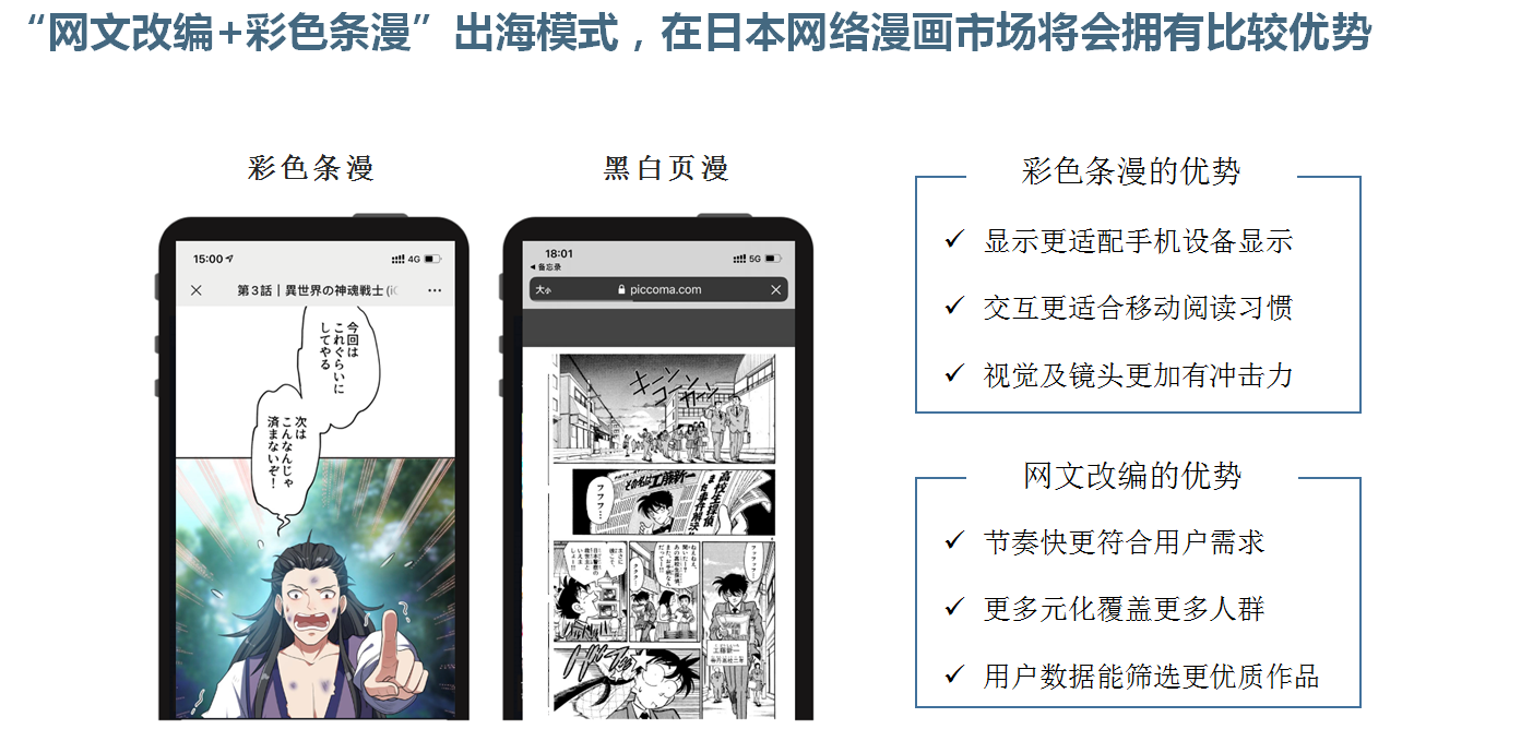 日本的网络漫画主要有黑白页漫和彩色条漫两种形式。前者是纸质版黑白的页漫扫描到网络上发行;条漫是彩色的,适合手机阅读,有更好的视觉冲击力。在日本,尽管网络漫画发展迅速,但条漫品类发展非常滞后。而中国网文数量庞大,具有故事性优势,玄幻、热血、恋爱等题材适合制作条漫;产能方面,中国的网文和条漫的制作也有着流程化、工业化的成熟模式。发挥网络文学内容优势,加强对日条漫传播,将以新的增长点助力网文出海规模的扩大。