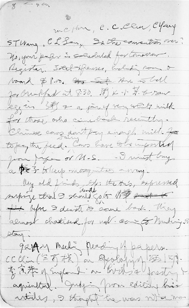 Hurrah!“中国科学社!”A beautiful gateway, two flags. Fine Bldgs. Look, who's here? MK Tang,KL Yin, MT Hu! Tunfu Hu, HC Zen, CK Huang, KF Hu, PW Tsou, MC Hu, CC Chu, C Yang, STWang, CL Lan. Is the convention over? No, your paper is scheduled for tomorrow.好哇!“中国科学社!”美丽的大门,两面旗帜,漂亮的楼房,瞧!都是谁在这儿,MK Tang, KL Yin, 胡明复!胡敦复,任鸿隽,CK Huang,胡刚复,邹秉文,MC Hu,竺可桢,杨铨,ST Wang, CL Lan。“会议结束了吗?”“没有,你的论文在明天宣读。”(本段识读及翻译由赵新那女士完成,第9册内文的英文识读均由赵新那女士完成。)