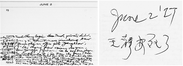 《赵元任日记》第12册内文,1927年6月2日晚,赵元任得到王国维的死讯,以及日记本中加的纸条